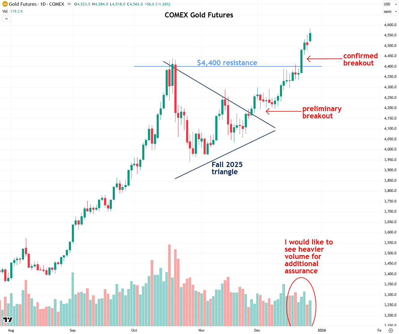 Let’s begin with gold, specifically in the form of COMEX futures. While silver and the platinum group metals have been grabbing the headlines, gold has held its own, closing at a record high of $4,562 on Friday. As I noted on December 22nd, gold finally broke above the key $4,400 resistance level that had formed at the mid-October peak. I described this breakout as a highly bullish development at the time, and sure enough, the price has continued to climb. Gold remains on track to reach approximately $5,200, as I explained in late November.