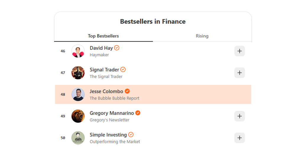 In November 2025, The Bubble Bubble Report broke into Substack’s Top 50 best-sellers in the finance category, ranking at #48: