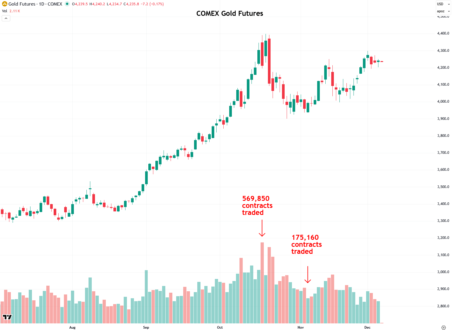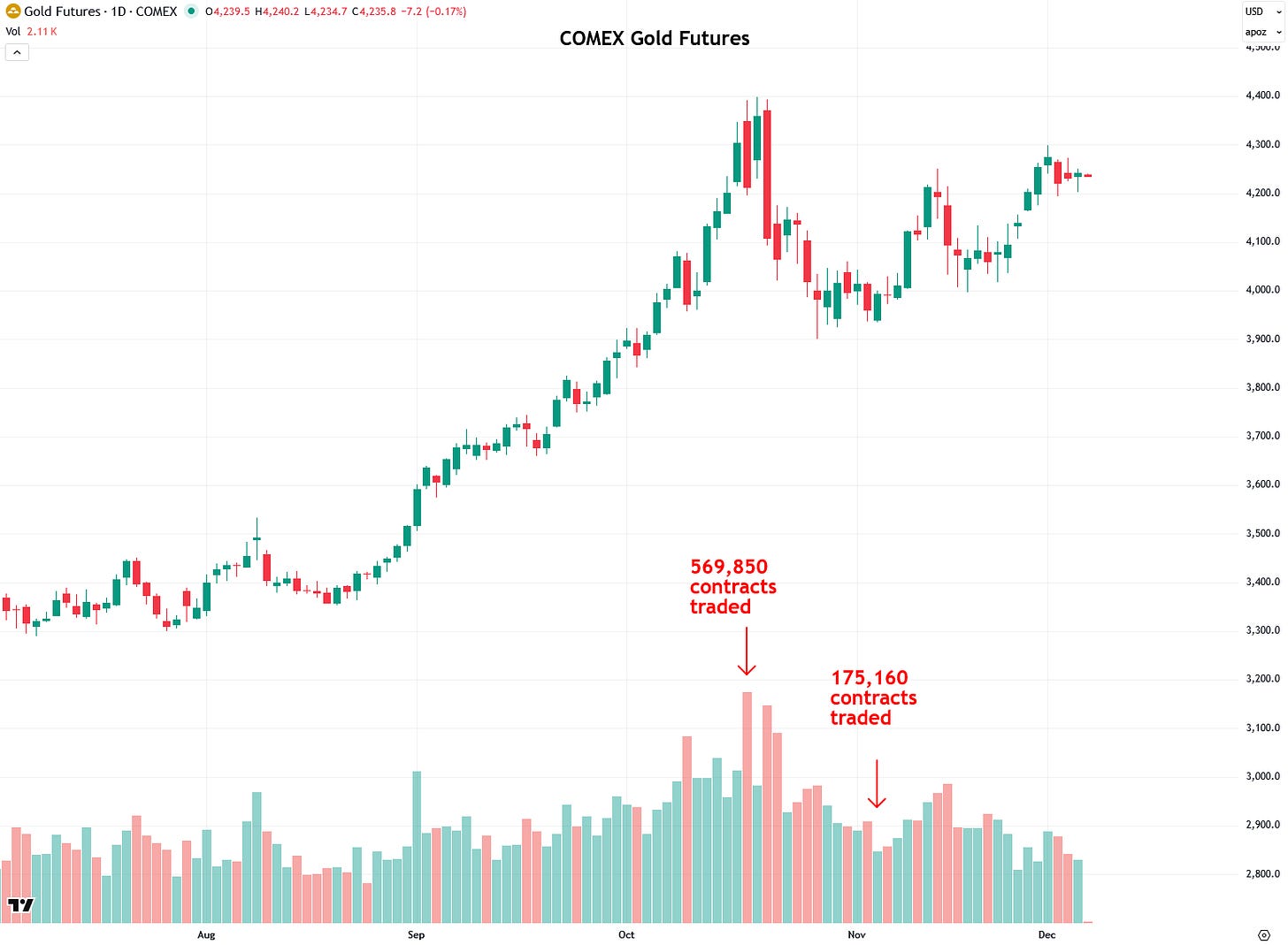 One point I want to make about volume in precious metals is that COMEX futures are the best place to monitor volume because that is where most price discovery occurs. The spot market, on the other hand, does not report volume, although charting services often show tick volume, which is a proxy for actual trading volume based on price changes (ticks) within a specific time period. It is often a decent approximation, but COMEX futures volume is much more accurate for analysis purposes like what we are doing today.