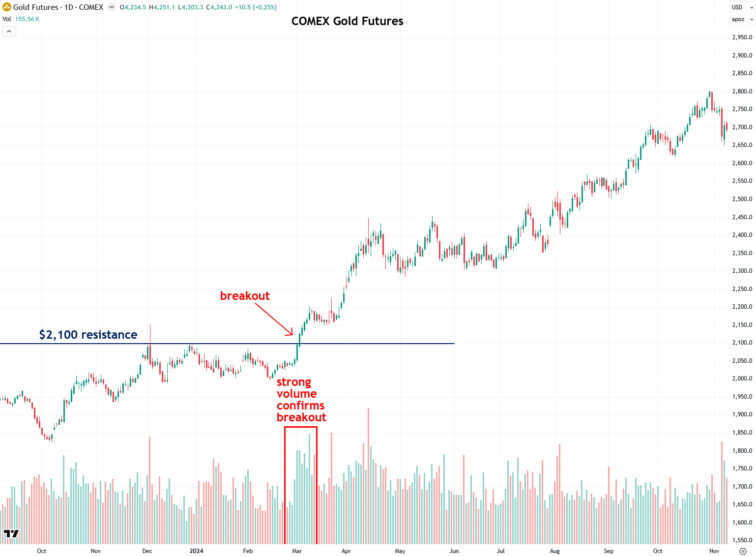So let’s look at some examples of successful breakouts and how trading volume was used to confirm them, starting with COMEX gold futures in March 2024, which is the breakout that led to the powerful bull market gold is in now.