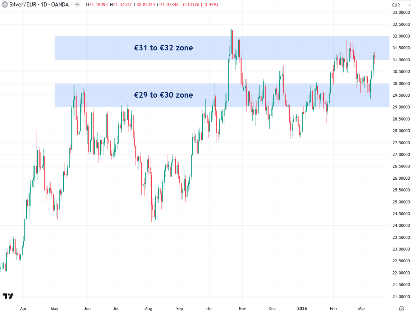 I closely monitor silver priced in euros because it provides valuable insights by stripping away the influence of U.S. dollar fluctuations, offering a clearer view of silver’s intrinsic strength. In euro terms, silver tends to respect key levels such as €30, €31, and €32, forming well-defined areas of support and resistance.