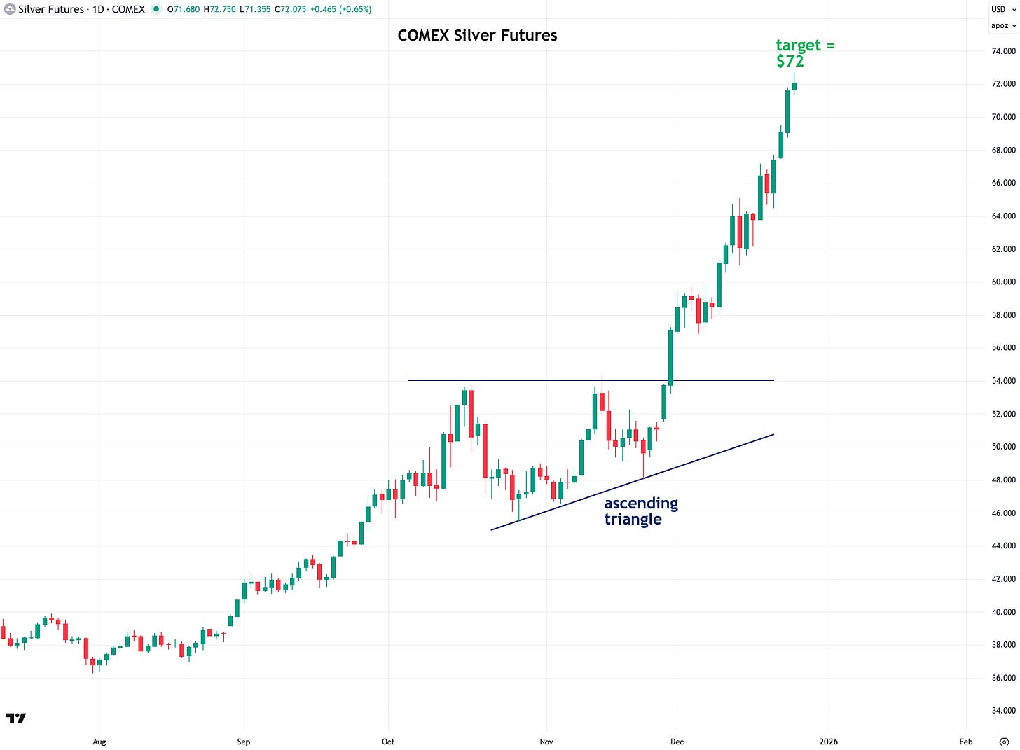 Starting with silver, you can see that it hit its $72 target in just about a month after I set it: