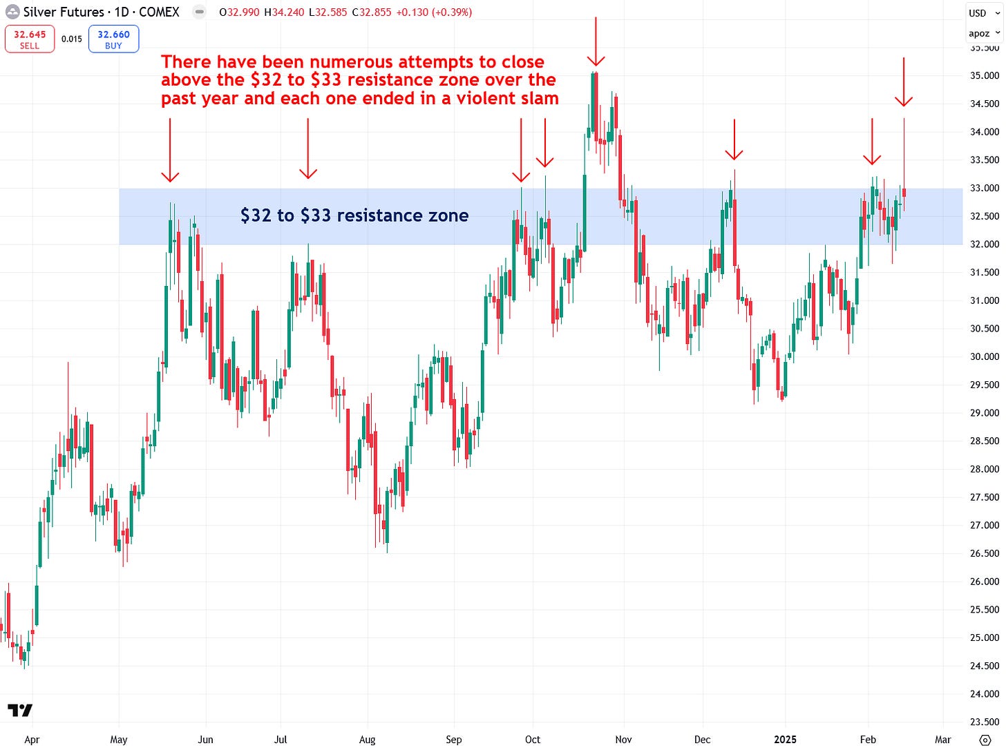 Friday was a frustrating day for us silver bulls. During the Asian and European trading sessions, COMEX silver futures surged to $34.24—rising $1.25, or 3.8%—as silver made a determined push to break through the long-standing $32–$33 resistance zone, which has acted as a price ceiling for much of the past year. The silver investing community cheered as the metal seemed on the verge of a breakout, one that could ignite a bull market akin to gold’s powerful rally over the past year. However, once the U.S. trading session began, silver was brutally slammed back down, erasing all of its gains in a matter of hours.