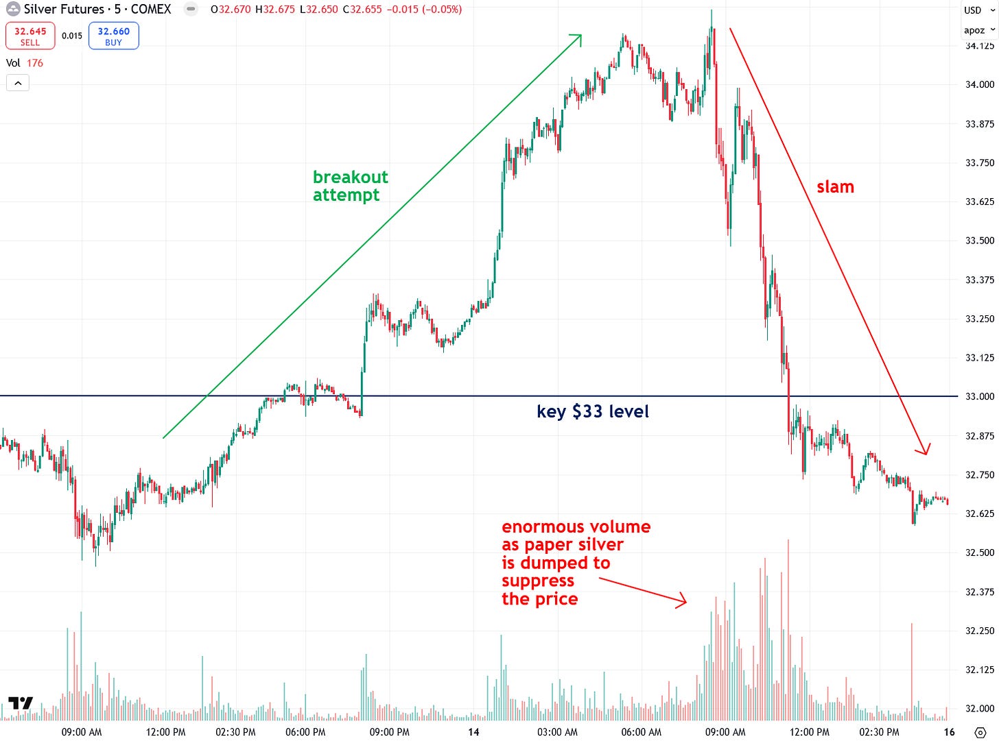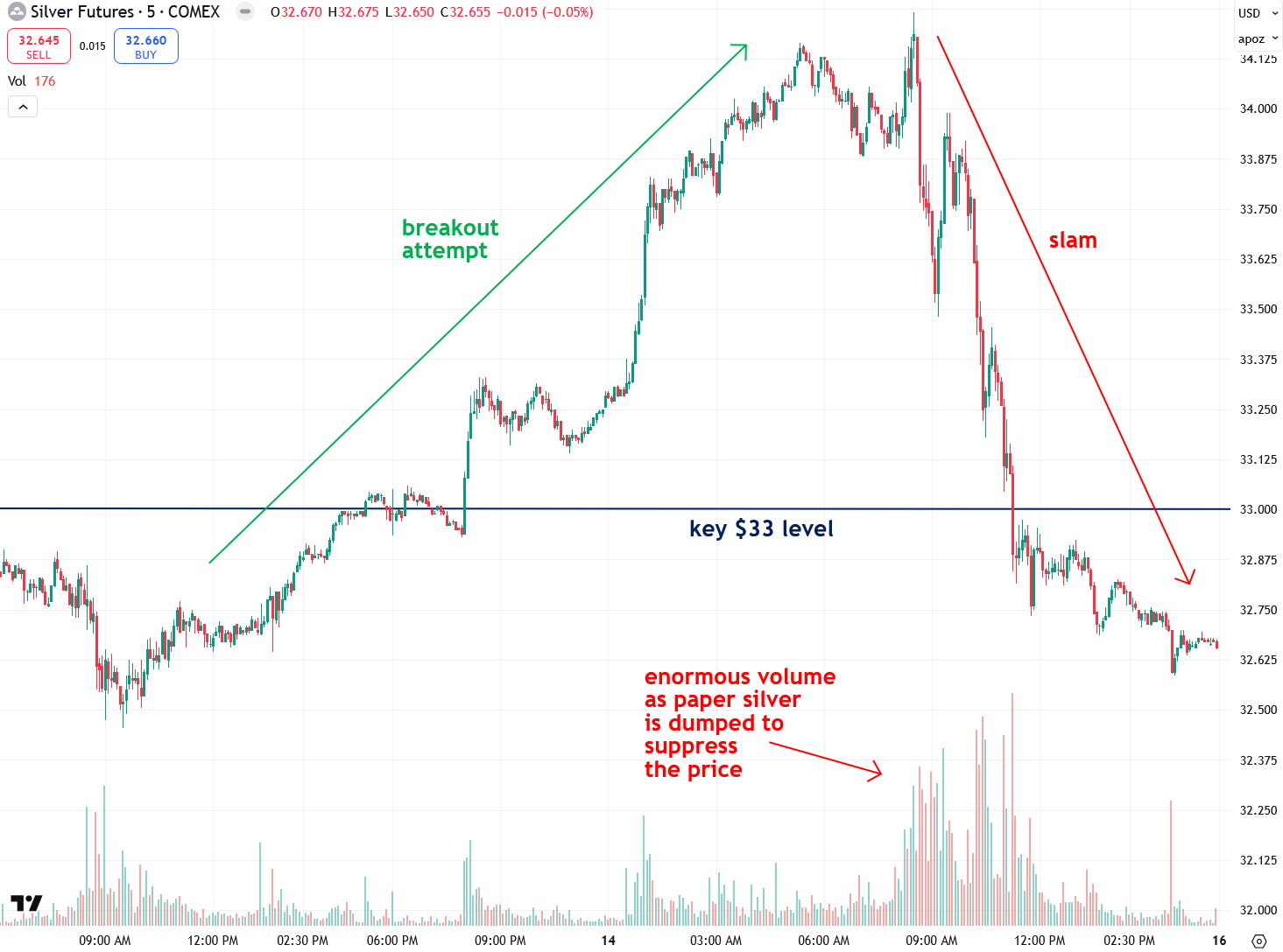 The intraday price chart highlights silver’s attempt to break above the critical $33 level, only to be swiftly pushed back below it. A massive surge in trading volume accompanied this move, signaling the large-scale dumping of unbacked “paper” silver in the form of futures contracts—an apparent effort to suppress the price. It’s important to note that this wasn’t physical silver flooding the market, but rather paper silver being used to exert downward pressure.