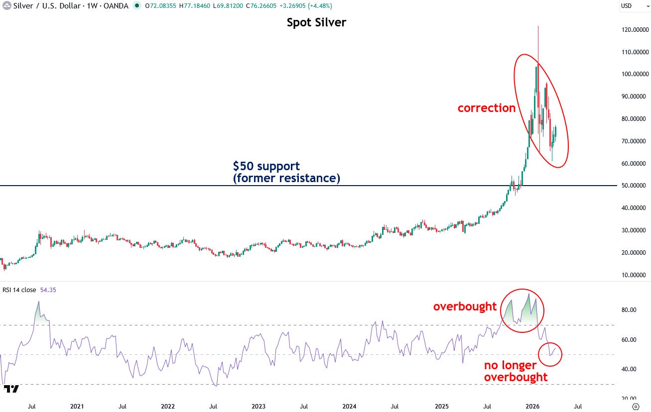 As the chart shows, in November, silver finally broke through the $50 resistance level that had capped its progress for decades. Fueled by strong momentum after the breakout, it soared as high as $121 in late January. At that point, however, it became overheated, also known as overbought, signaling that a healthy cooling-off period was likely ahead, as I noted at the time.