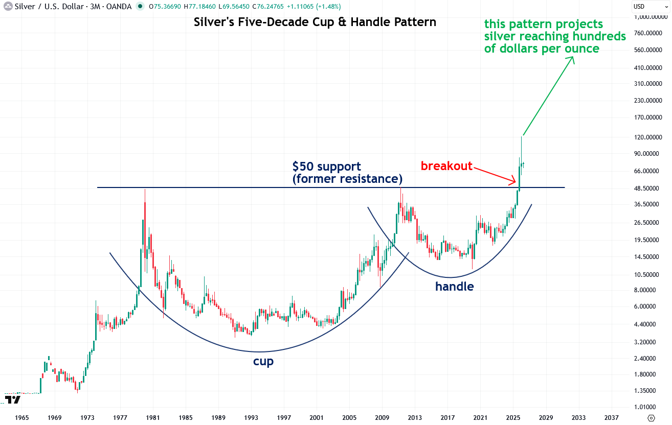 As I regularly point out, back in November, silver broke out of a massive cup and handle pattern that had been forming since the 1960s. Based on the sheer size of that pattern, it projects silver reaching several hundred dollars per ounce, with a minimum target range of $300 to $500 during this bull market.