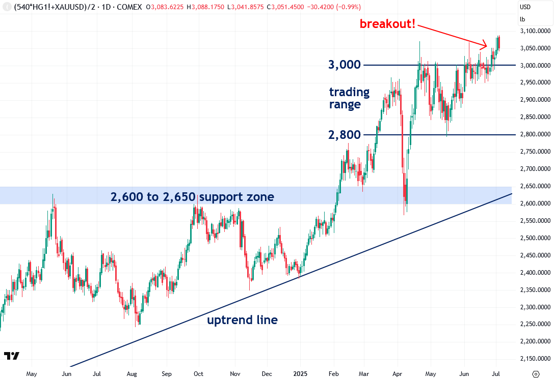 Excitingly, the SSPI finally broke out of its 2,800–3,000 trading range over the past few days, where it had been stuck since March — a promising sign for silver. This breakout suggests a new tailwind for silver, as strong performances in both gold and copper tend to put pressure on arbitrage trading algorithms to buy silver in sympathy. The move in the SSPI was one of the key confirmations I had been watching for, along with a breakout in silver priced in euros, which I’m still waiting to see.