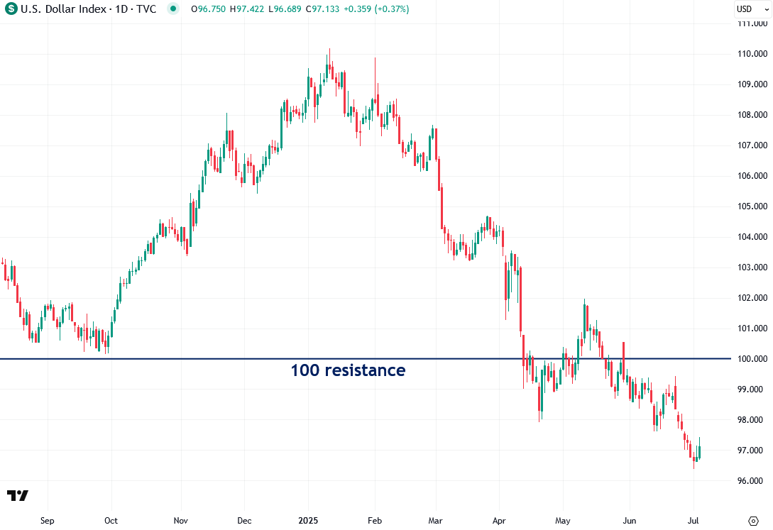 Another key asset I closely monitor to better understand the broader commodity landscape is the U.S. dollar—specifically the U.S. Dollar Index, which has historically moved inversely to commodities, including precious metals. As I’ve recently noted, the Dollar Index broke below the critical 100 support level, which has now flipped into resistance.