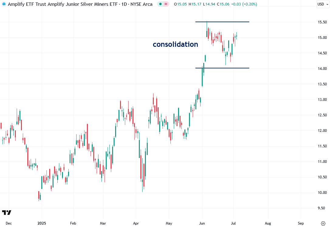 A bull flag pattern is also clearly visible in SILJ, the popular ETF that tracks junior silver mining stocks: