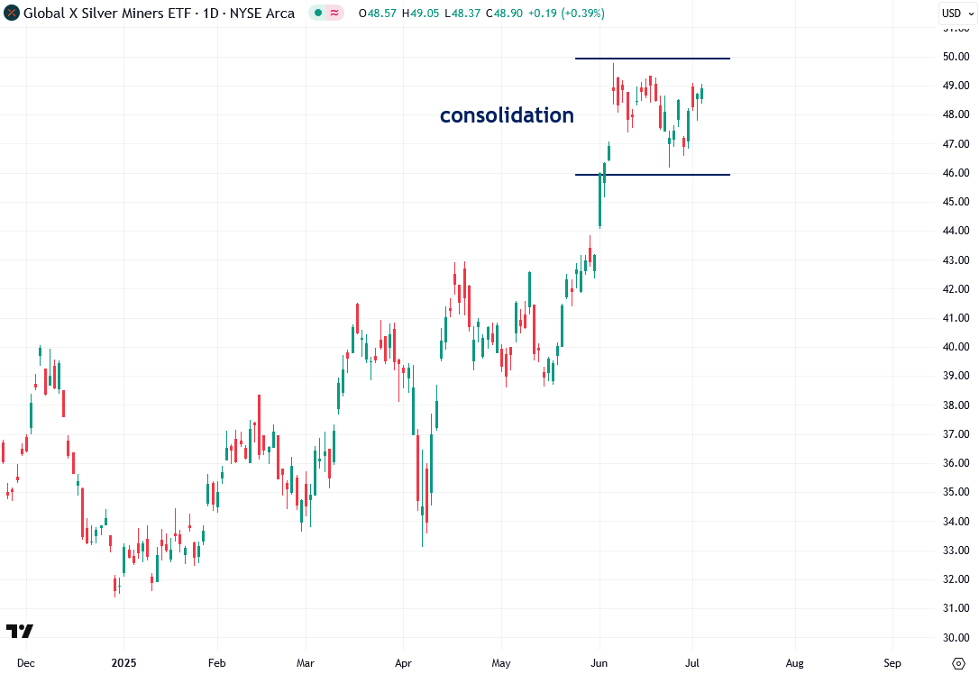 The consolidation — or bull flag — pattern forming in silver is also clearly visible in silver mining stocks, as reflected in popular exchange-traded funds (ETFs) like SIL, which tracks large silver miners. A decisive breakout from silver’s bull flag, combined with a high-volume breakout in SIL, is likely to ignite a powerful rally in the silver mining sector. I personally invest in both silver bullion and select mining stocks (see my recent report on my favorite silver miner and the broader bullish case for silver miners).