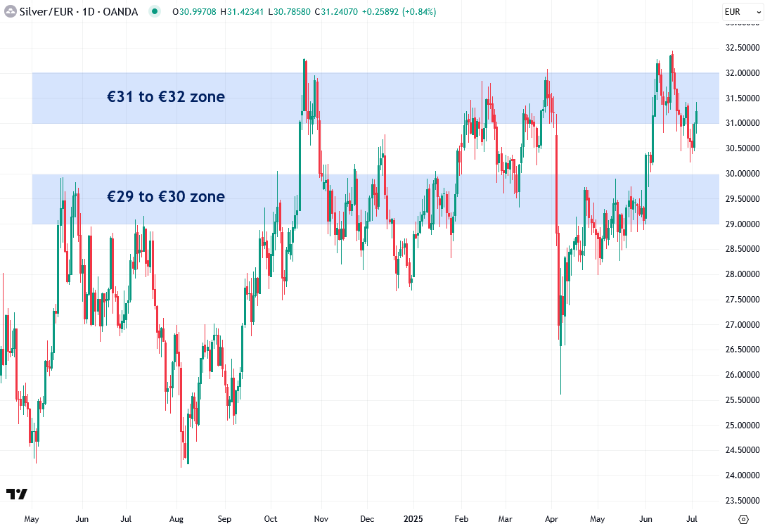 Similar to COMEX silver futures, silver priced in euros has struggled with two major resistance zones: €29–€30 and €31–€32. Recently, it managed to break through the €29–€30 level, but its first attempt to clear €31–€32 was short-lived, as silver retreated in tandem with a strengthening euro.