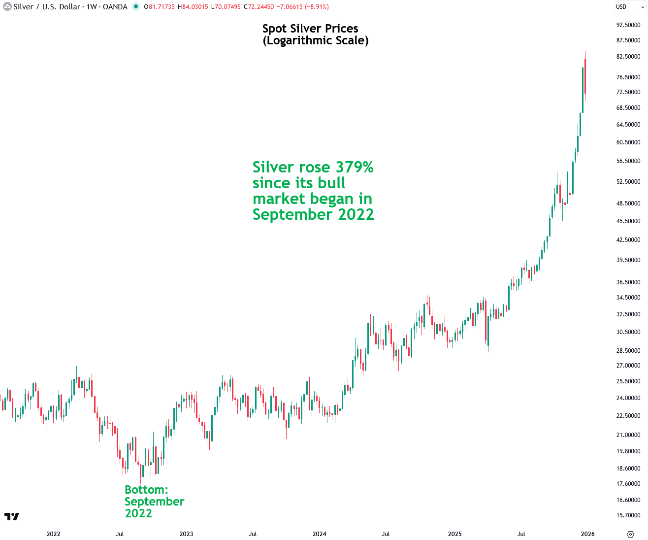 Let’s start with a look at silver’s performance over the past few years. The current bullish cycle in silver began when it bottomed in September 2022, and it has since surged 379%.